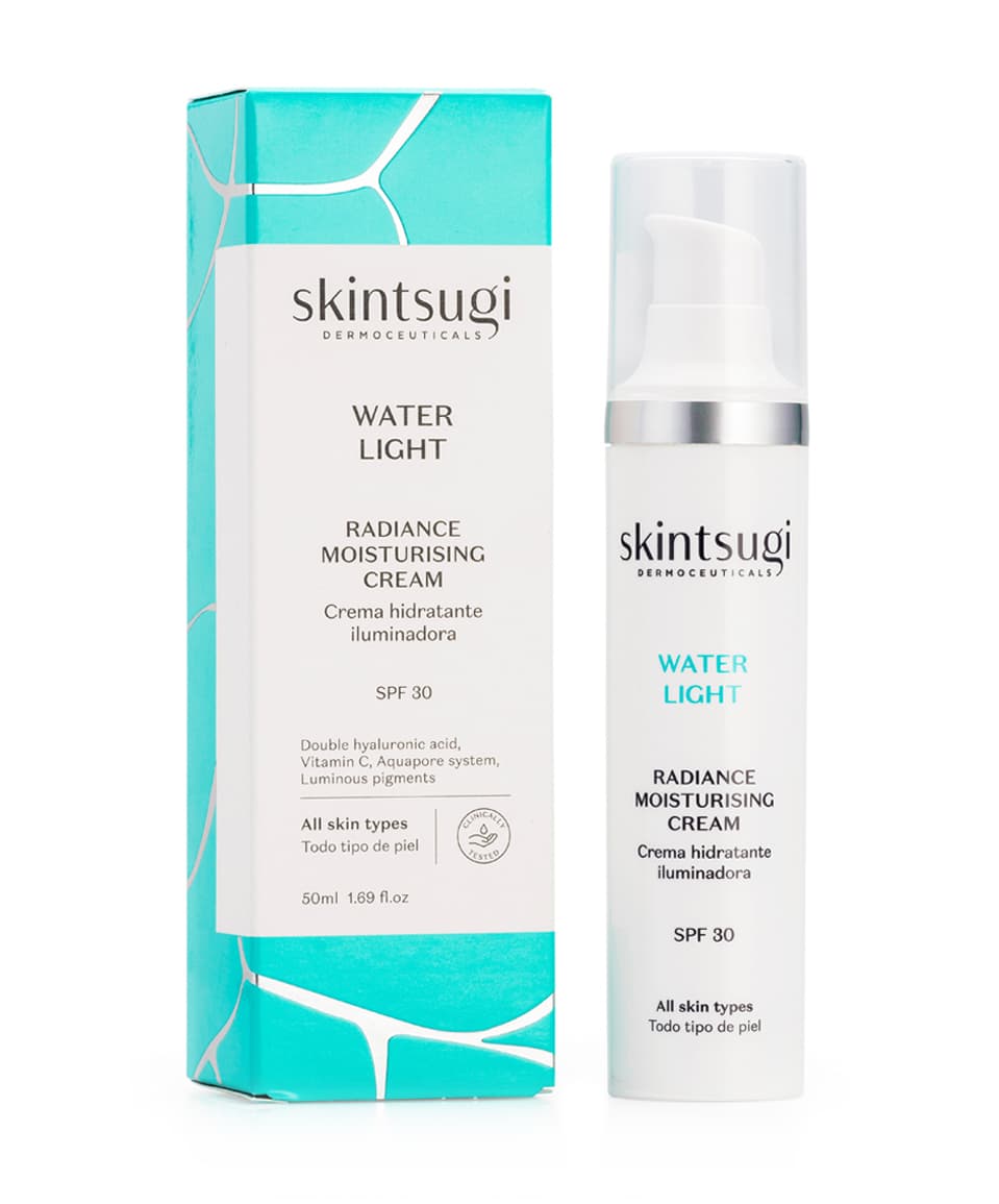 Nuestra crema Water Light, usándola cada mañana, incrementa el nivel de hidratación y potencia la luminosidad natural de nuestra piel. Su alto contenido en vitamina C estabilizada ejerce una acción clarificante para un tono de la piel uniforme y su factor de protección solar alto SPF30 previene del foto-envejecimiento.